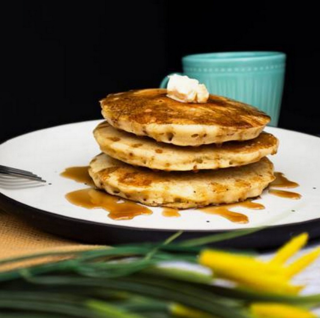 Hotcakes con Huevo Revuelto, Tocino y Jamón.