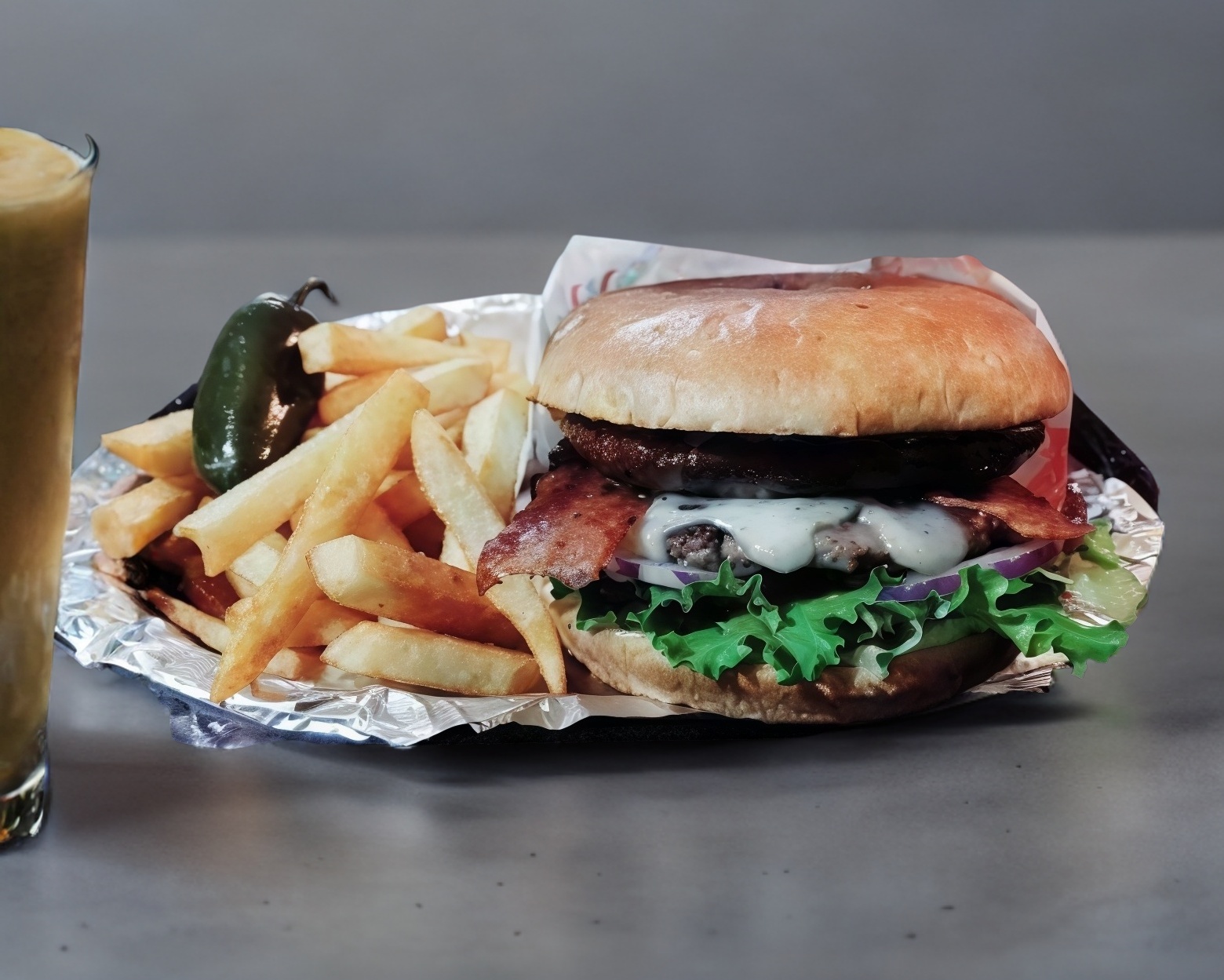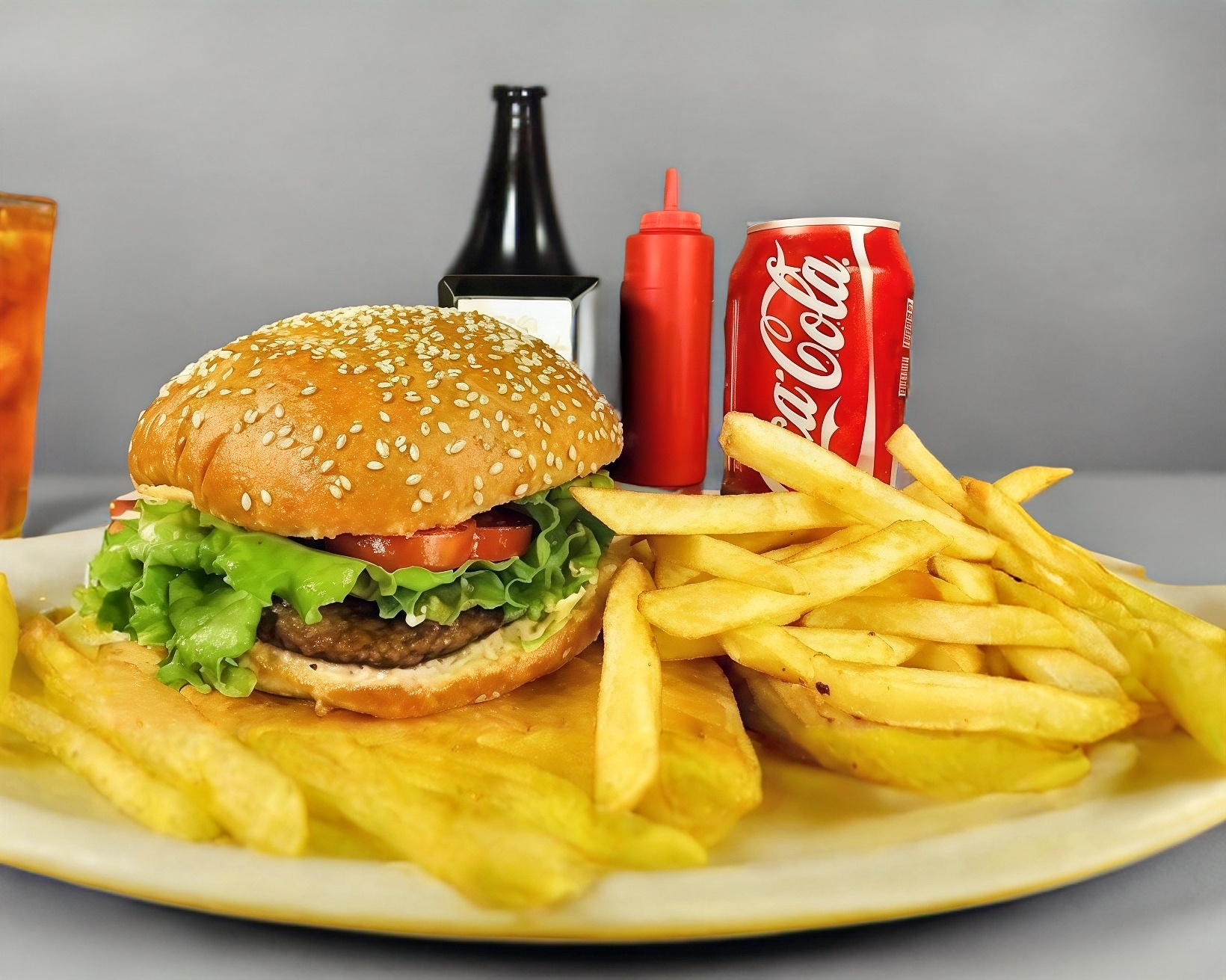 Hamburguesa de arrachera, papas y refresco, preparada al momento.