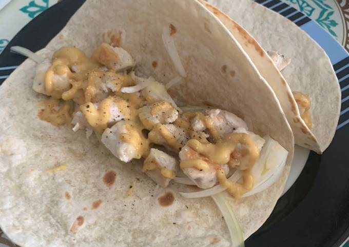 Tortilla de harina, pechuga de pollo, cebolla y quesillo.