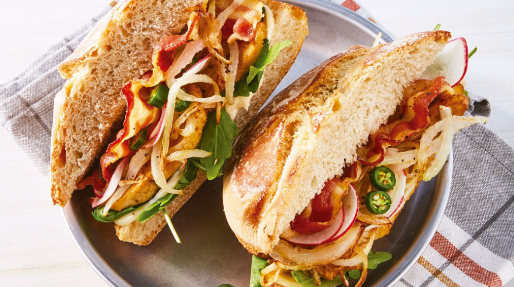 Pan de 12 granos, bistec o pechuga de pollo, queso manchego, tocino, lechuga, jitomate, cebolla, rajas, acompañado con salsa BBQ, preparado al momento.