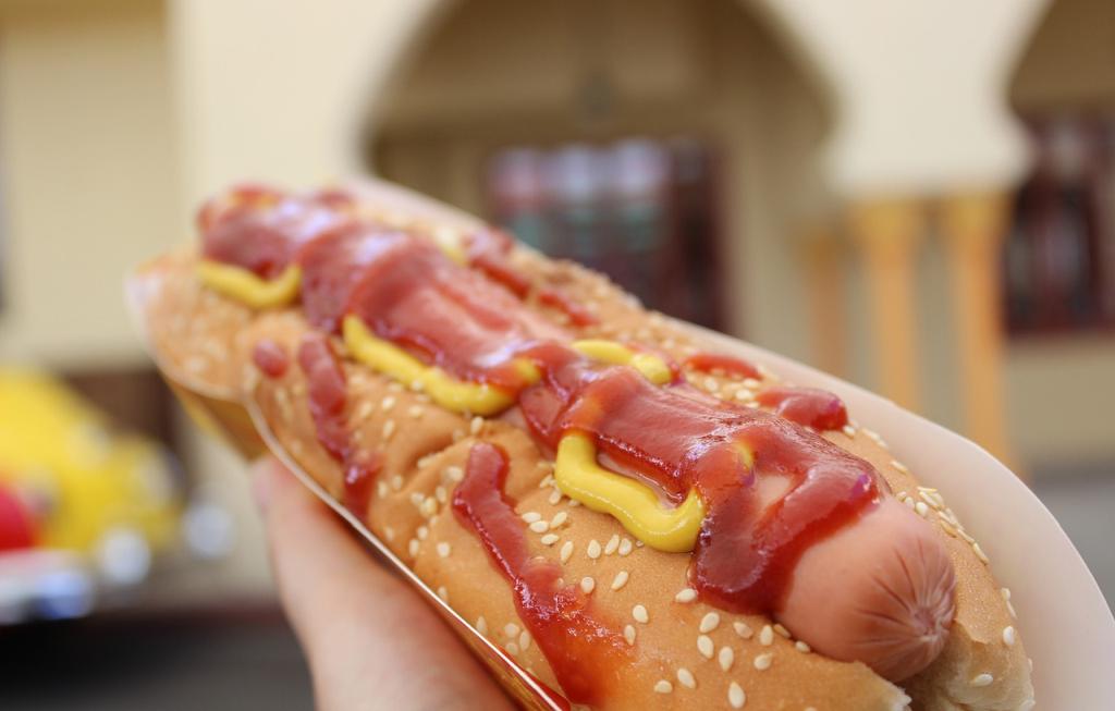Salchicha importada, tocino americano, cebolla, jitomate, rajas, catsup y mostaza, preparado al momento.