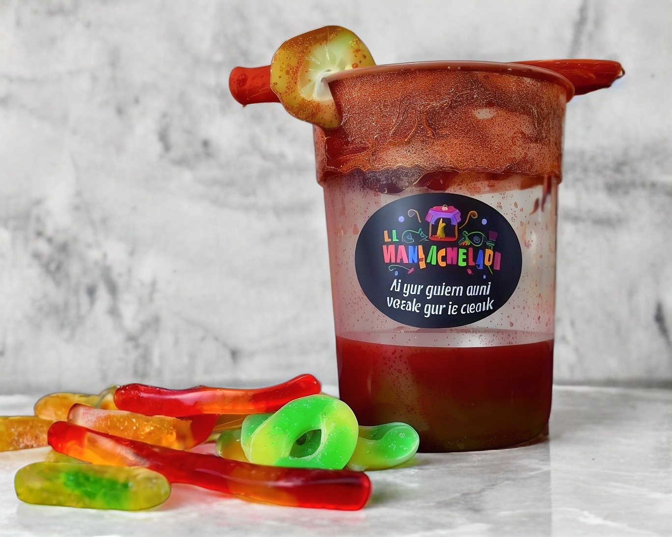 Escarchada con jalea y chilito tradicional, limón, jarabe de manzana verde, jarabe de grosella, gomitas de gusano y manzana y banderilla de tamarindo.