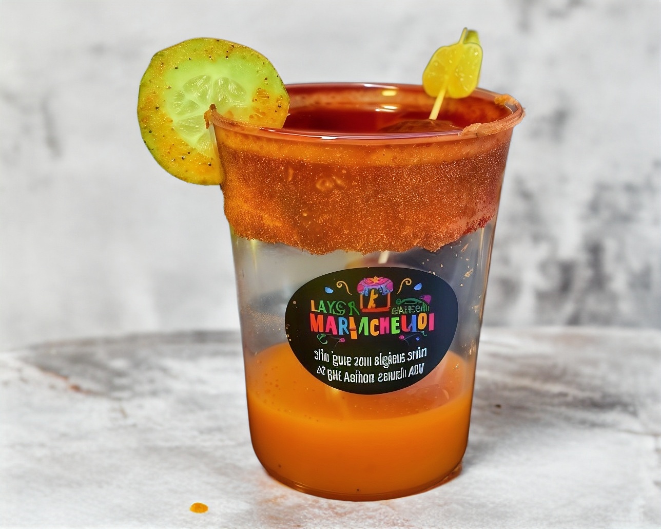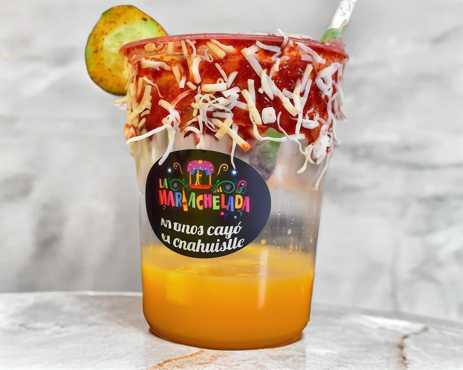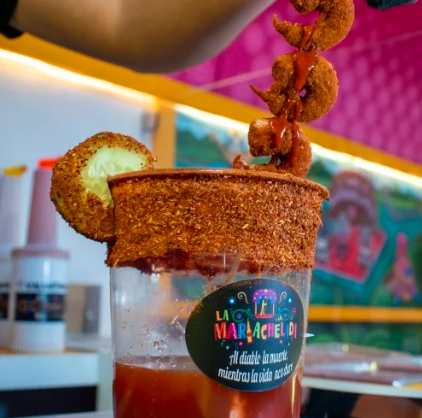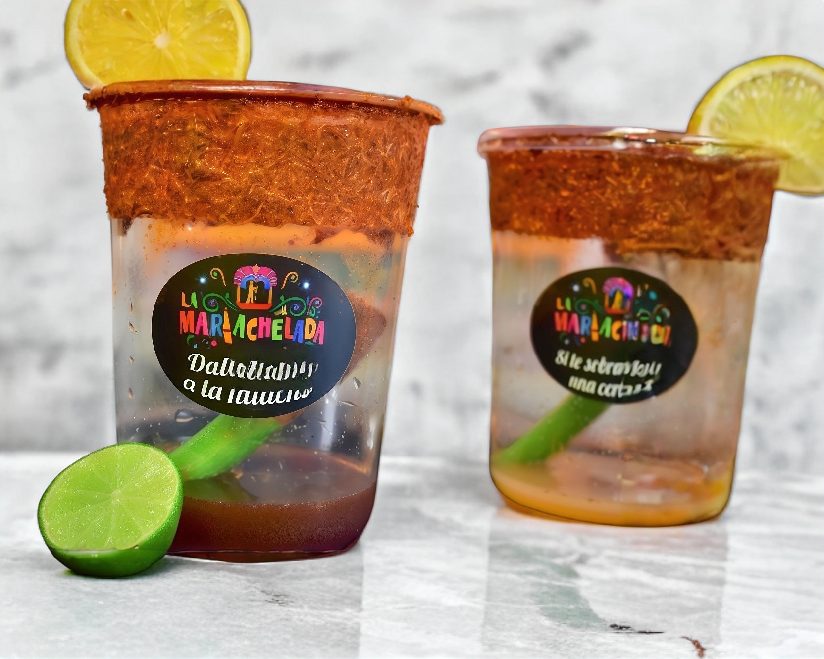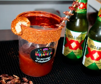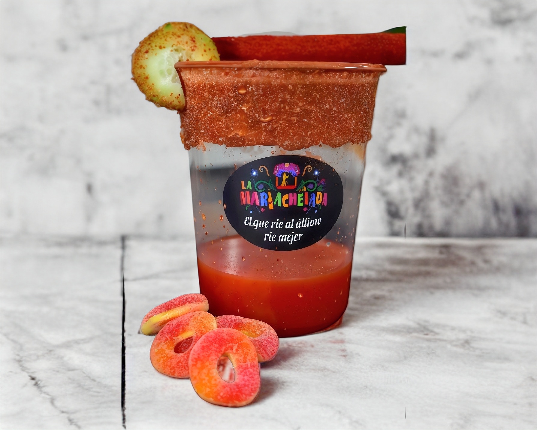 Cerveza preparada escarchada con jalea tradicional y tajín, limón, salsa negra, clamato y brocheta de camarones.