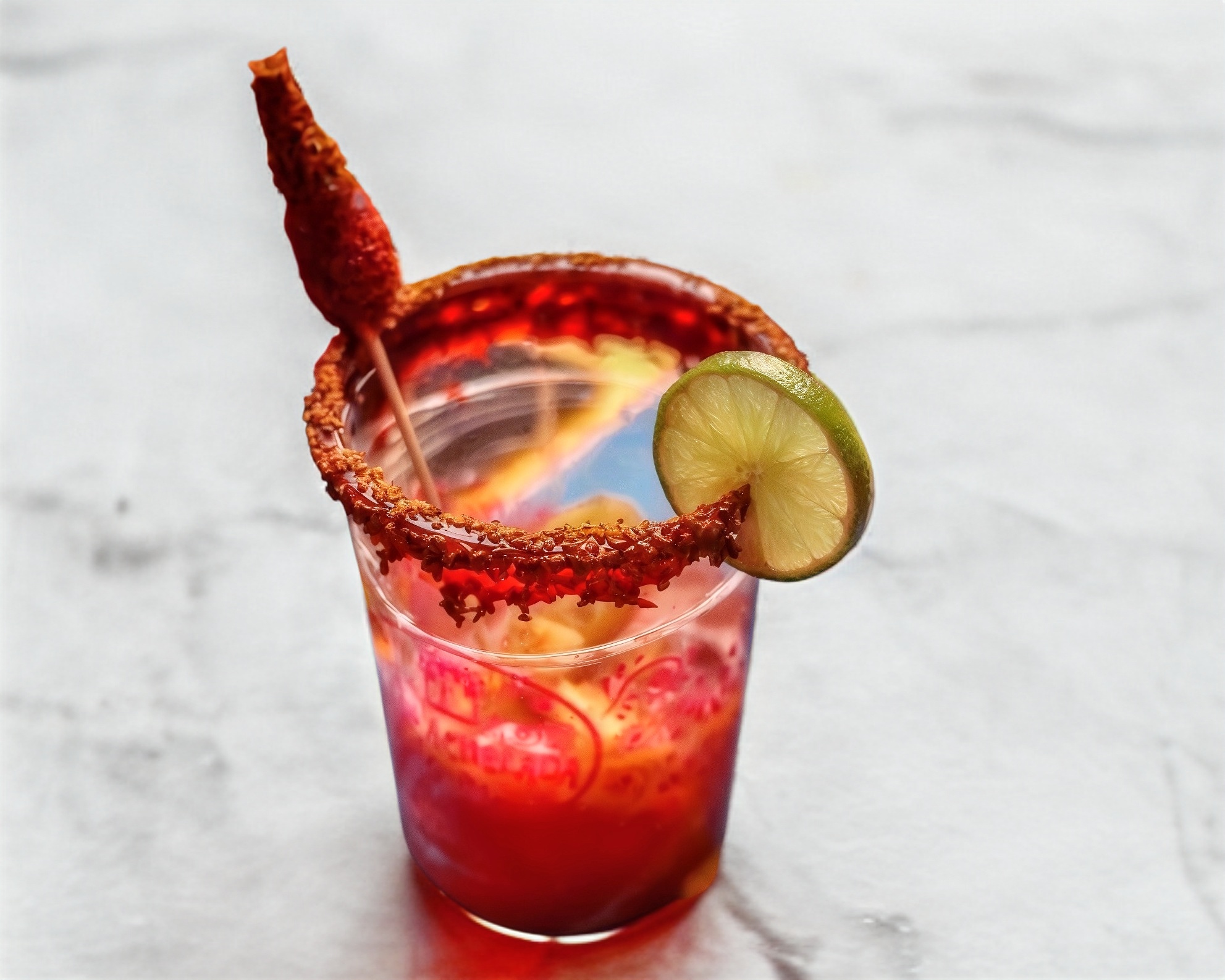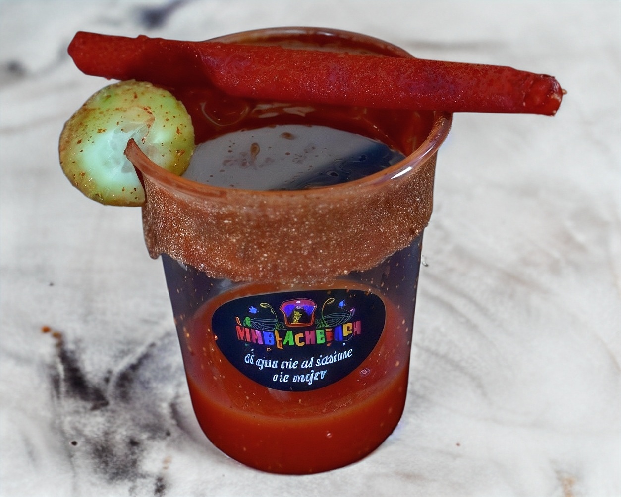 Cerveza preparada escarchada con jalea y polvo de chapulín, limón, salsa negra, clamato, salsa habanero, valentina, brocheta de chapulines.