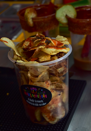 Escarchada con tajín y tamarindo tradicional, limón, salsa negra y apio.