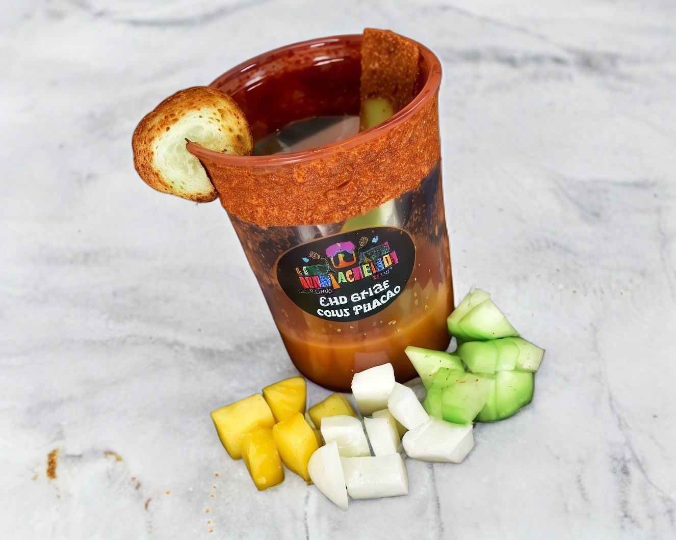 Cerveza preparada escarchada con jalea y chilito tradicional, limón, jarabe de pepino, de mango habanero, salsa habanero, pepino y banderilla.