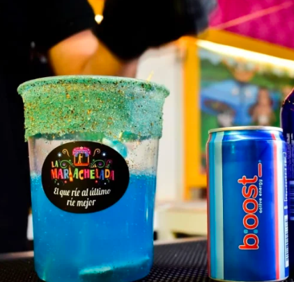 Cerveza preparada escarchada con jalea y chilito de mora azul, limón, boost y banderillas de gomitas de tiburones.