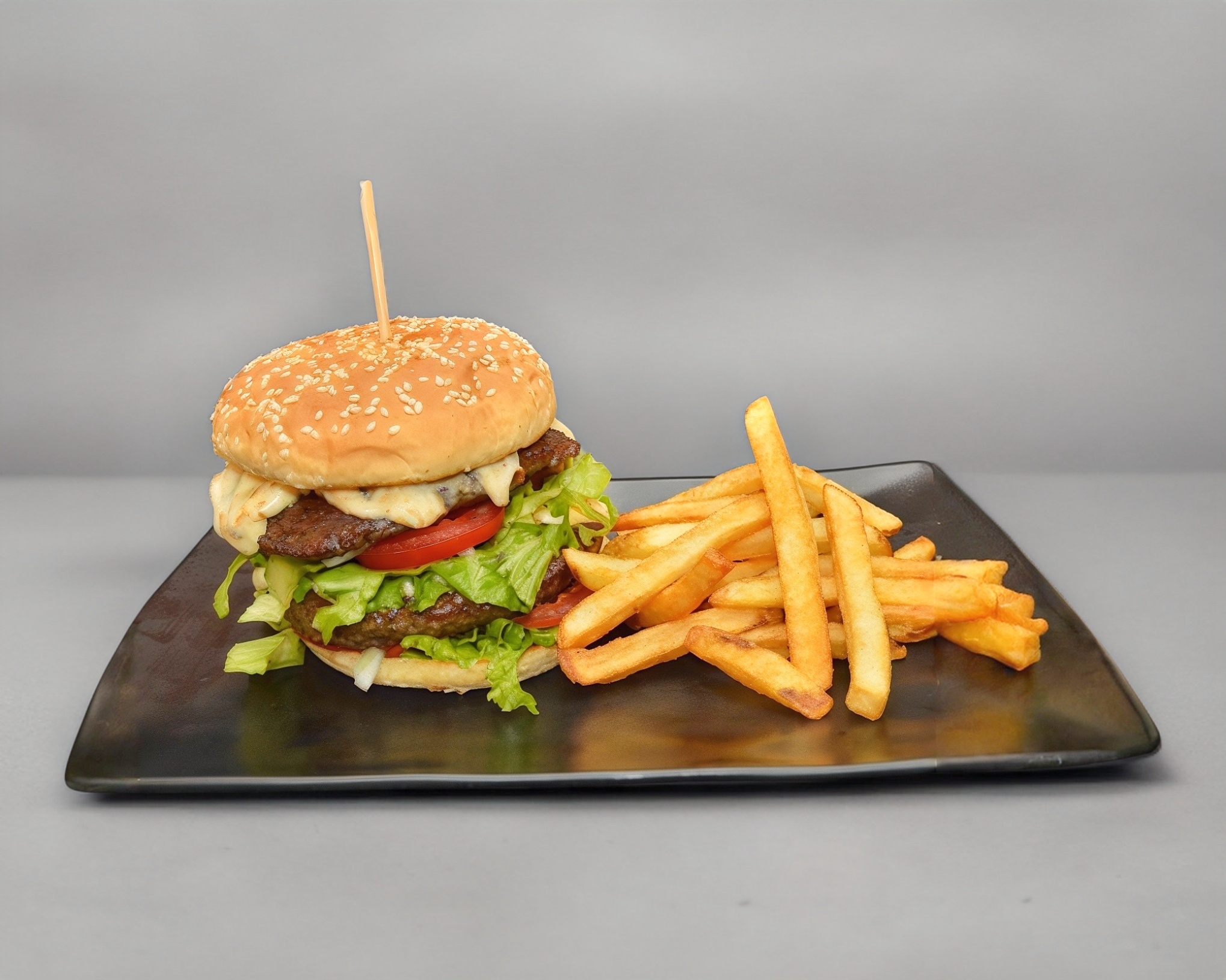 2 pzas de deliciosa carne ANGUS queso Oaxaca, lechuga, jitomate, cebolla blanca y acompañada con papas a la francesa