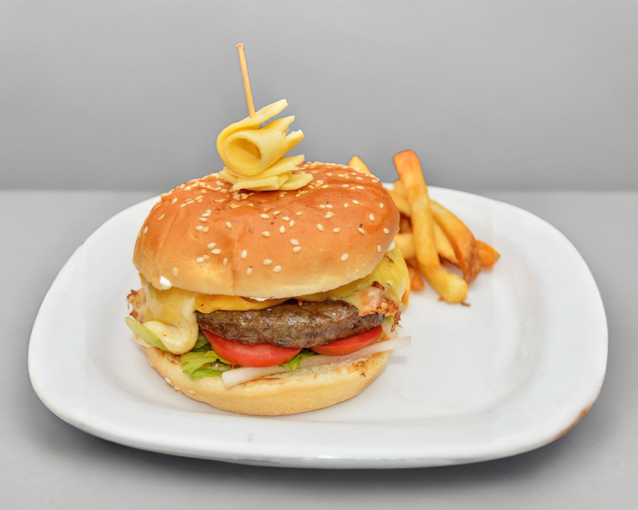 Deliciosa carne de ANGUS queso amarillo, oaxaca, manchego, philadelphia, lechuga, jitomate, cebolla blanca y acompañada con papas a la francesa
