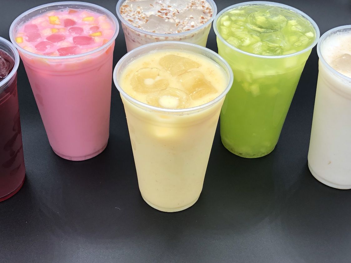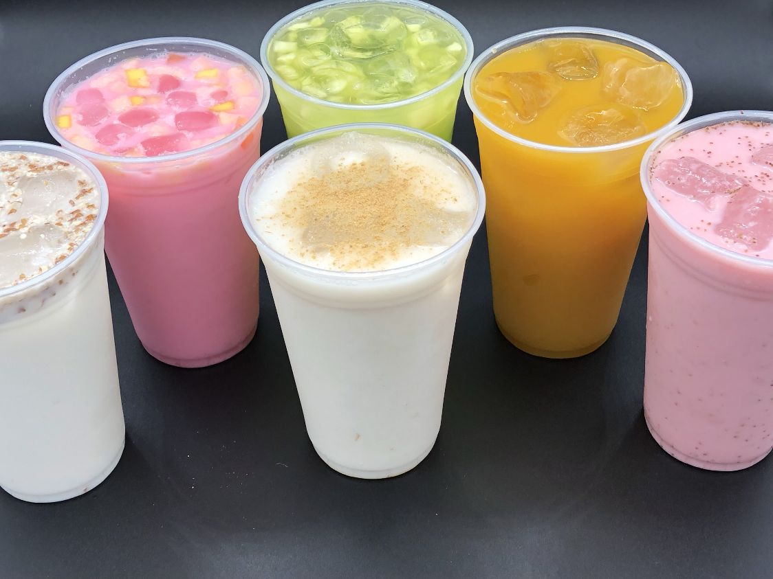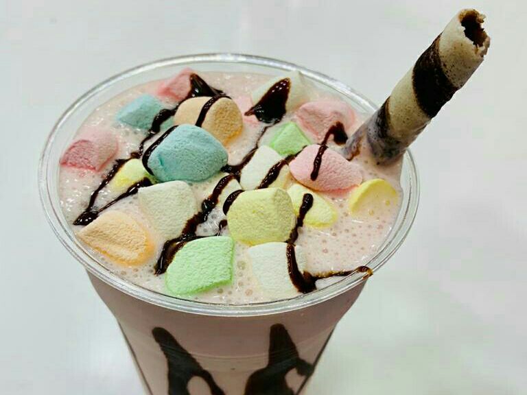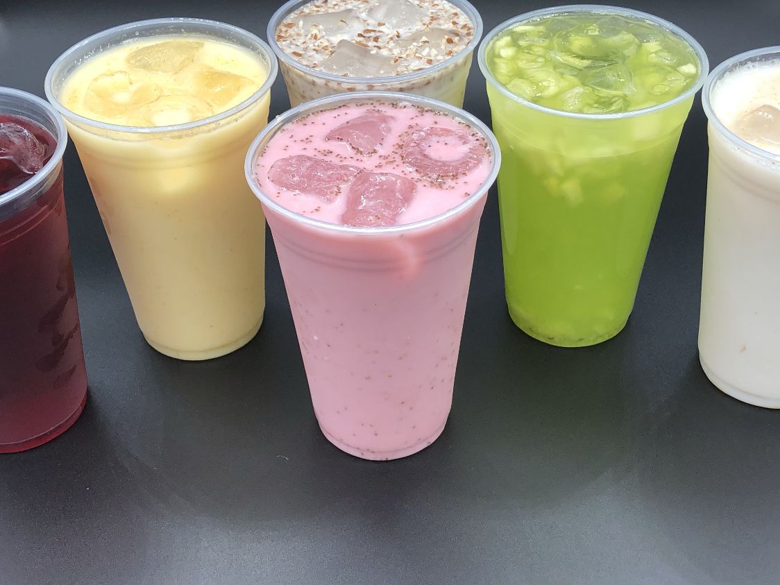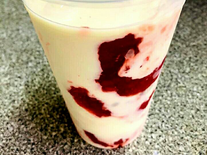 Vaso de 16 oz de fresa picada congelada, acompañada de leche dulce cremosa especial de la casa.