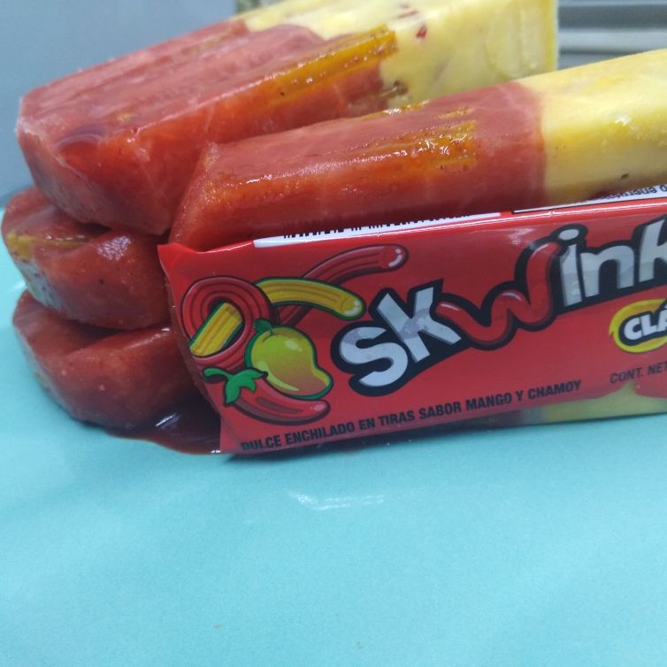 paleta combinada mango chamoy con dulce de skwinkles sabor mango chamoy