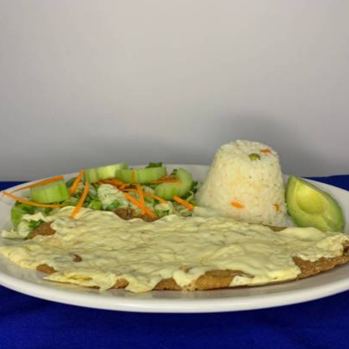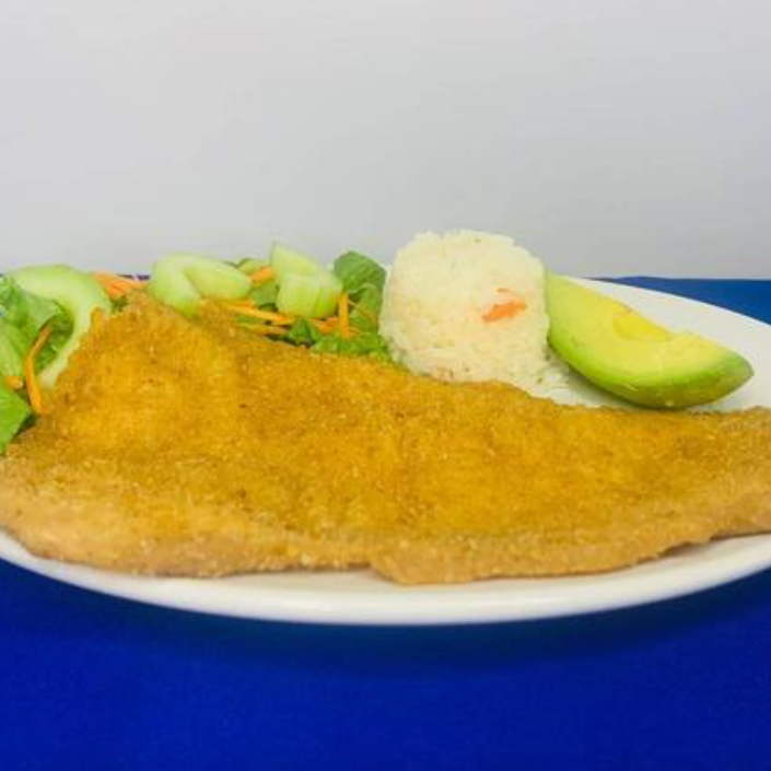 Exquisito filete empanizado (160 g,), se acompaña de ensalada de lechuga, zanahoria rallada, pepino, arroz y aguacate, con un toque de vinagreta a la ensalada.
