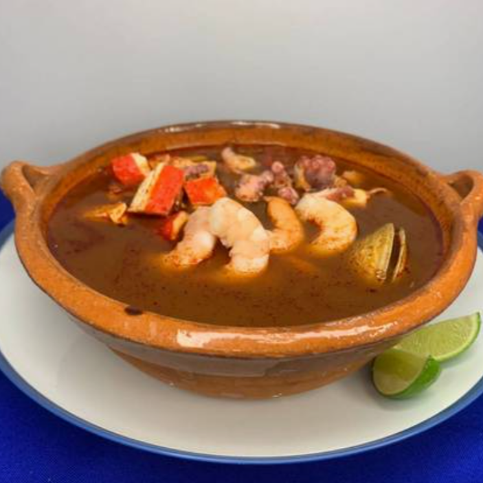 Exquisita sopa de mariscos de camarón pelado, ostión, pulpa de jaiba, pulpo, surimi y almeja.