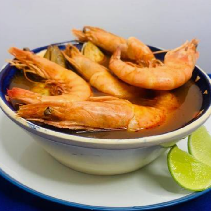 Delicioso caldo de camarón para pelar (7 pzas.), acompañado de almejas, preparado con la receta secreta de la casa.
