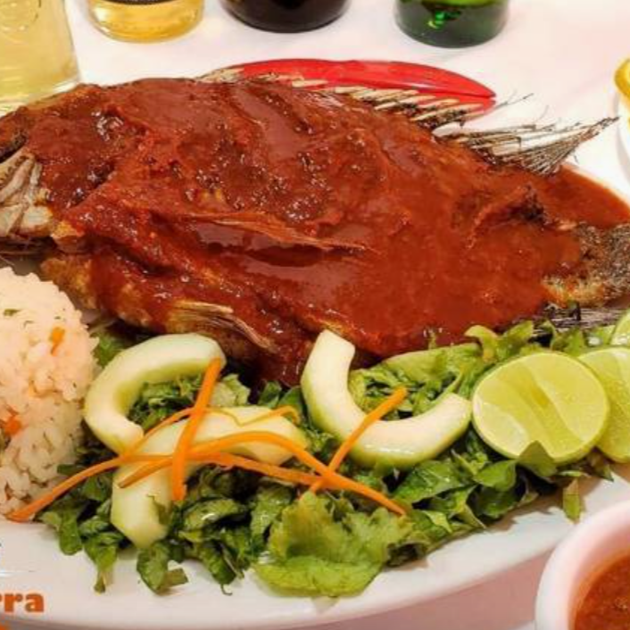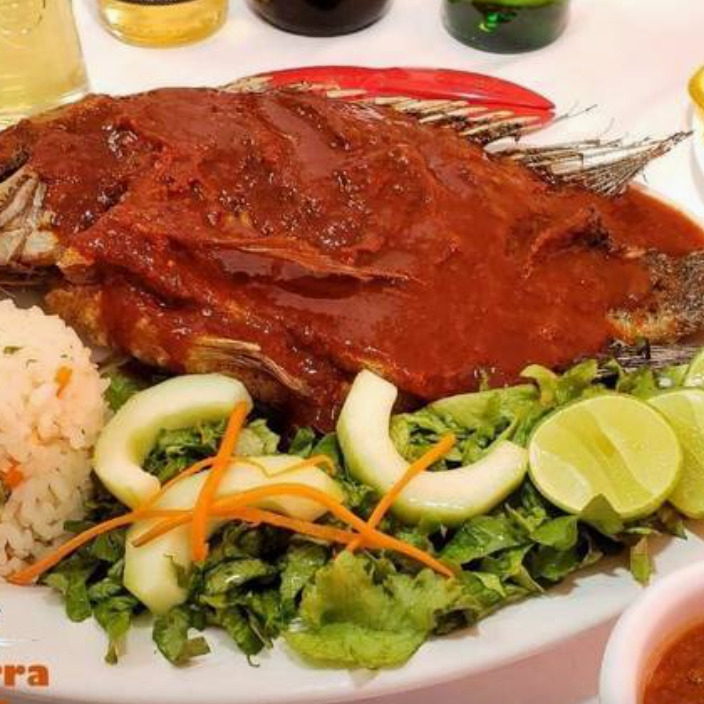 Exquisita mojarra (800 g) bañada con salsa a la diabla ligeramente picosa, se sirve con ensalada de lechuga, zanahoria rallada, pepino, arroz y aguacate, con un toque de vinagreta a la ensalada.