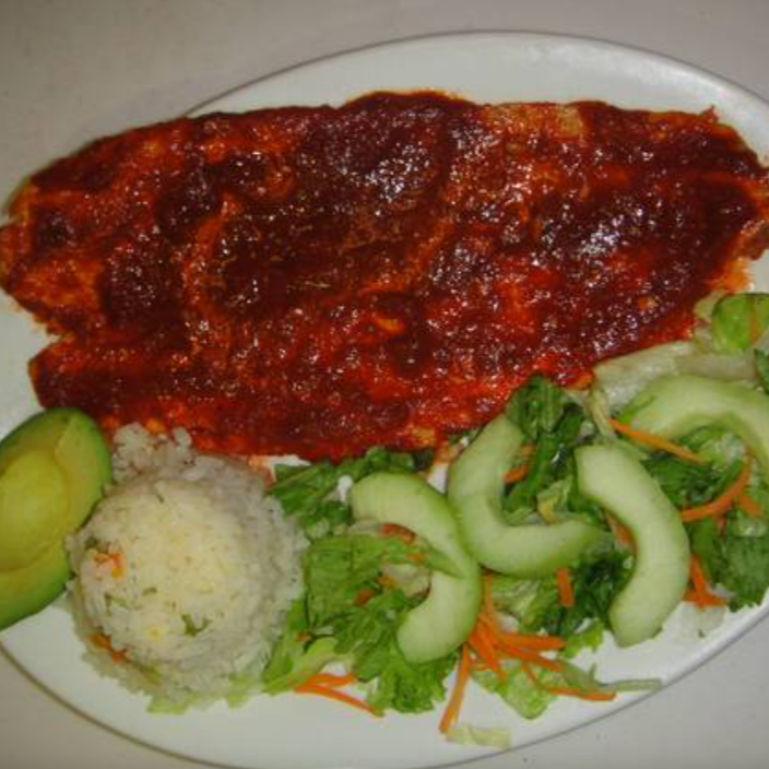 Exquisito filete (160 g,) bañada en salsa al chipotle, se acompaña de ensalada de lechuga, zanahoria rallada, pepino, arroz y aguacate, con un toque de vinagreta a la ensalada.