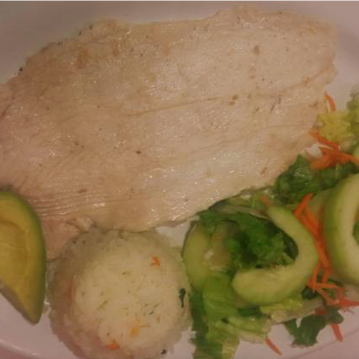 Exquisito filete a la plancha (160 g,), se acompaña de ensalada de lechuga, zanahoria rallada, pepino, arroz y aguacate, con un toque de vinagreta a la ensalada.