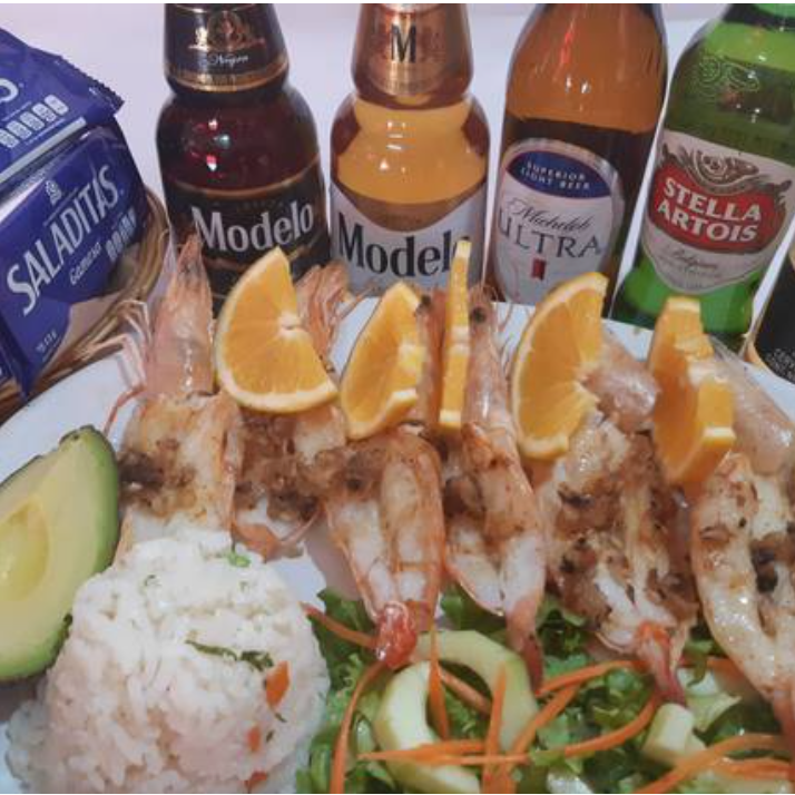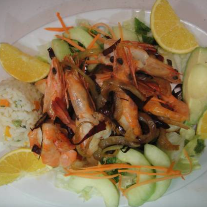 Exquisitos camarones (7 pzas,), preparados con trocitos de ajo dorados, acompañada de ensalada de lechuga, zanahoria rallada, pepino, arroz y aguacate, con un toque de vinagreta a la ensalada.