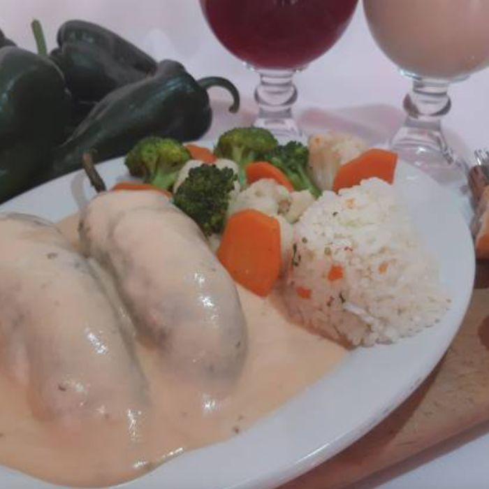Exquisitos chiles poblanos (2 pzas.), rellenos de camarón, pulpo y surimi, bañados con una deliciosa crema agridulce, se sirve con verduras cocidas al vapor y arroz blanco.