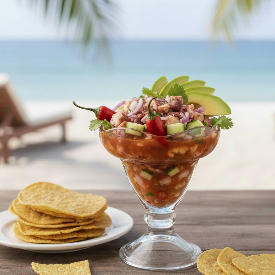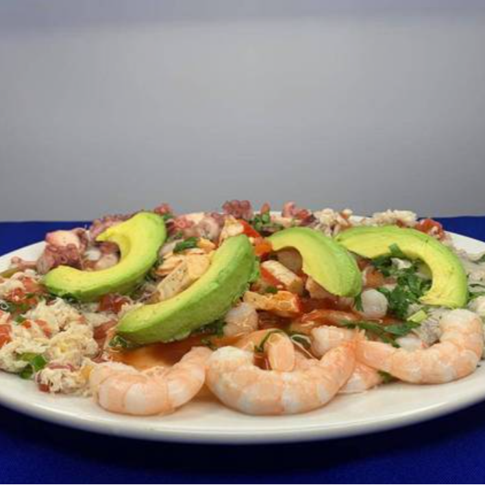 Deliciosa combinación de camarón, pulpa de jaiba, pulpo, ceviche de pescado y surimi, preparada al estilo Veracruz.