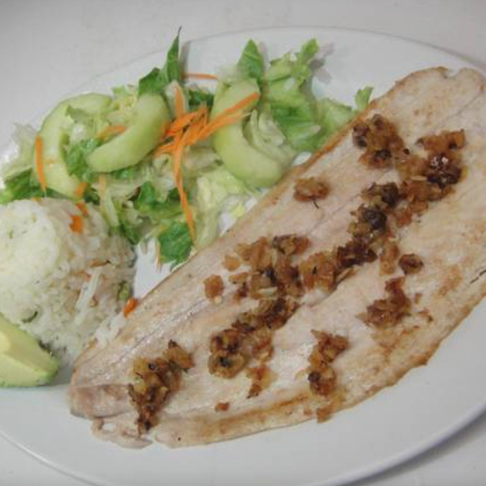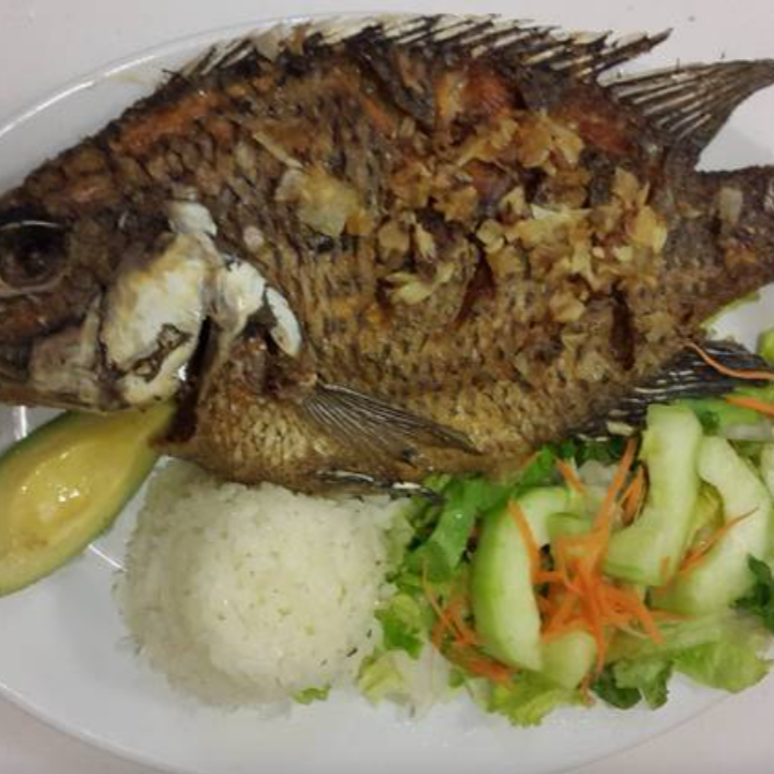 Exquisita mojarra (800 g) bañada en ajillo, acompañada de ensalada de lechuga, zanahoria rallada, pepino, arroz y aguacate, con un toque de vinagreta a la ensalada.
