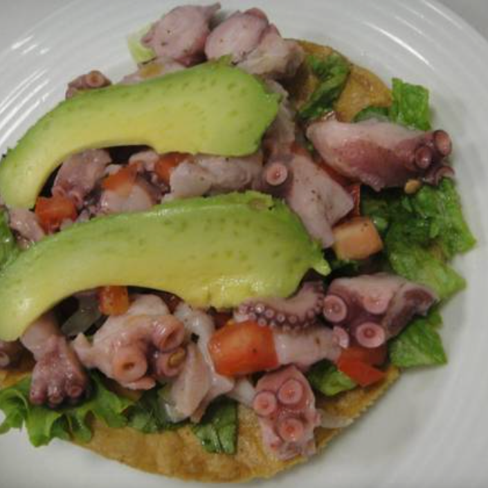 Deliciosa tostada de ceviche de pulpo preparada con un toque de mayonesa, lechuga y aguacate.