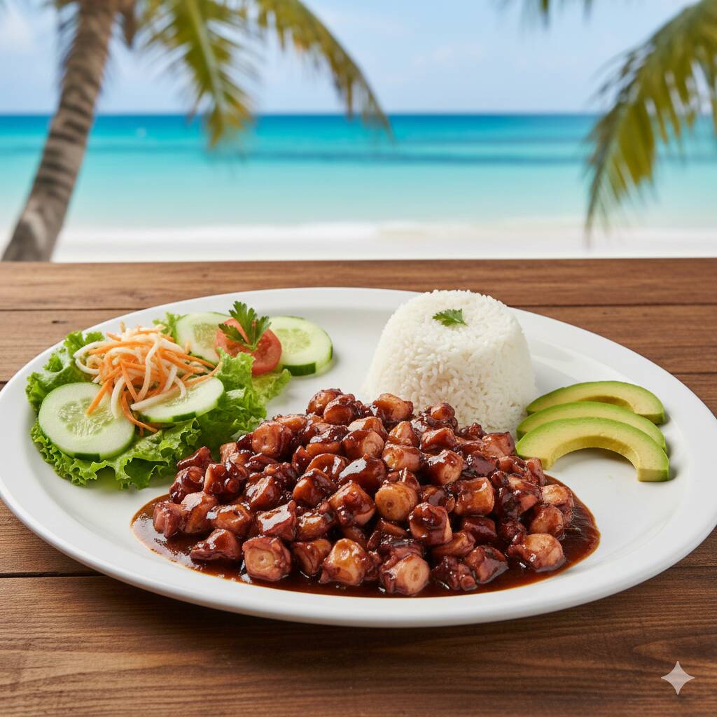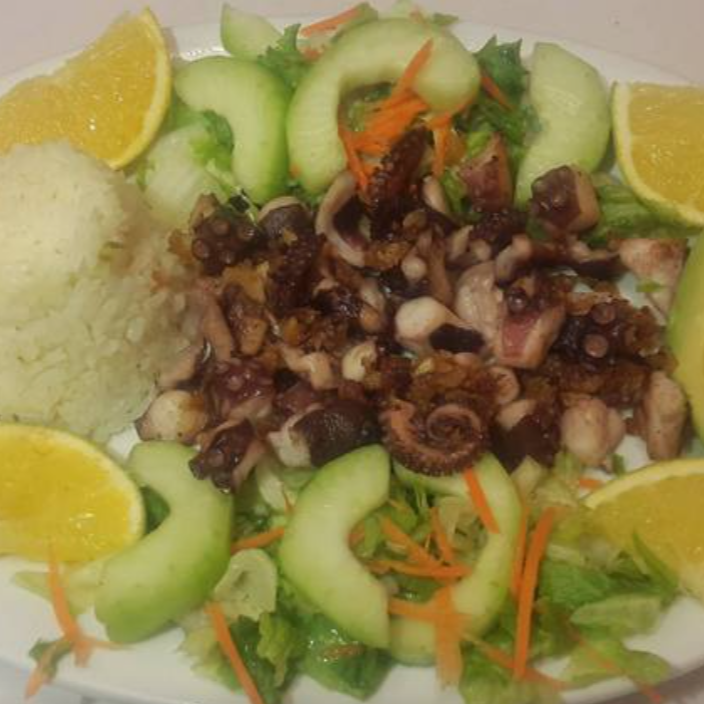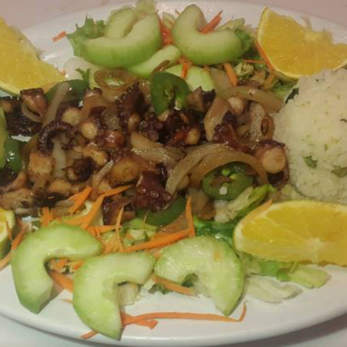 Delicioso pulpo (160 g) sofrito con cebolla y rodajas de chile cuaresmeño, se sirve con ensalada de lechuga, zanahoria rallada, pepino, arroz y aguacate, con un toque de vinagreta a la ensalada.