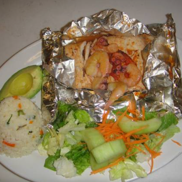 Delicioso filete de pescado (160 g), relleno de camarones, pulpo, jitomate, cebolla y queso Oaxaca, se sirve con ensalada de lechuga, pepino, zanahoria rallada, arroz y aguacate, con un toque de vinagreta a la ensalada.