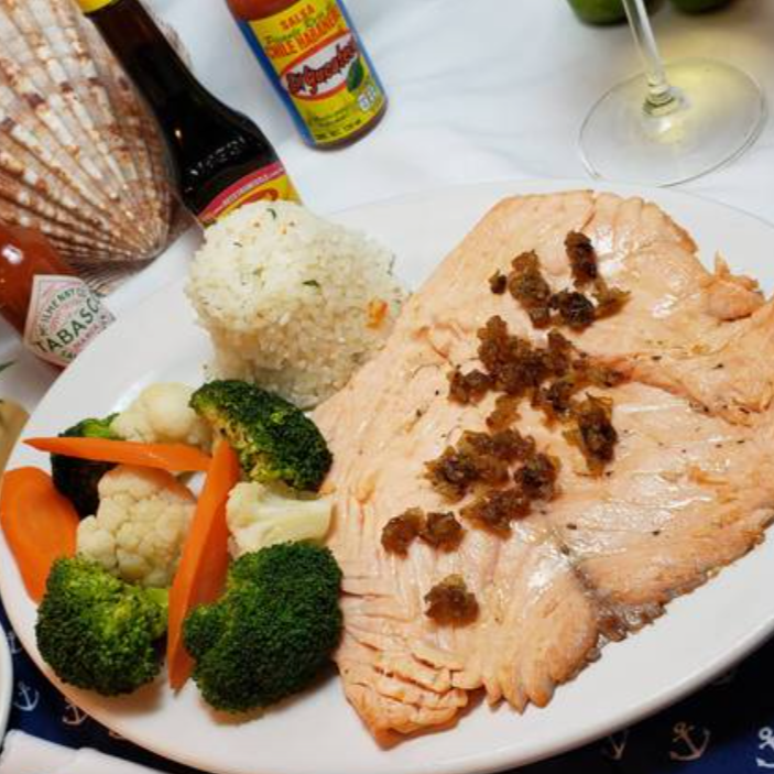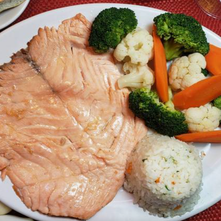 Exquisito filete de salmón con trocitos de ajo dorados (270 g), acompañado de verdura cocida al vapor y timbal de arroz blanco.