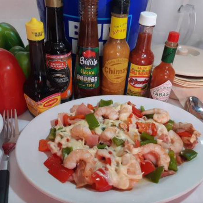 Exquisito alambre de camarón coctelero (15 pzas.), preparado con pimiento morrón, cebolla, tocino y queso Oaxaca gratinado.