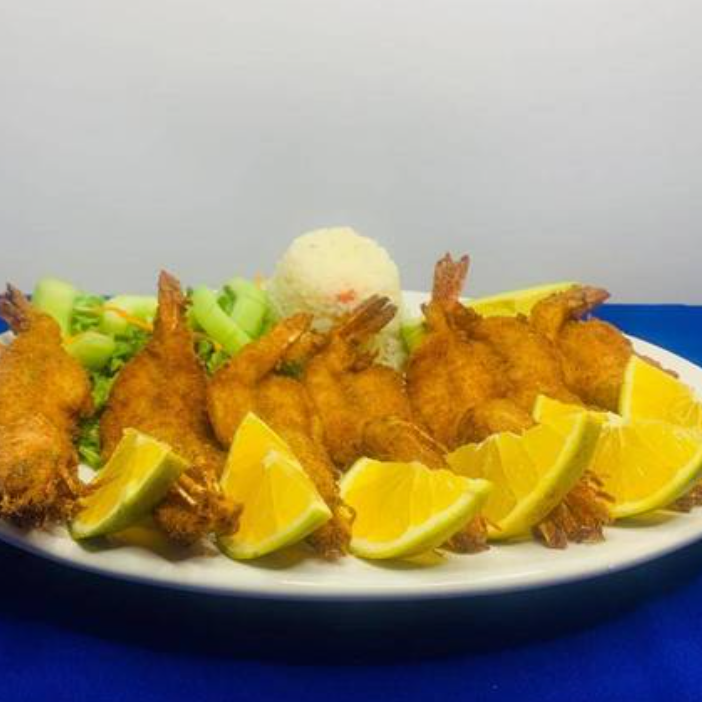 Exquisitos camarones empanizados (7 pzas,), se acompaña de ensalada de lechuga, zanahoria rallada, pepino, arroz y aguacate, con un toque de vinagreta a la ensalada.