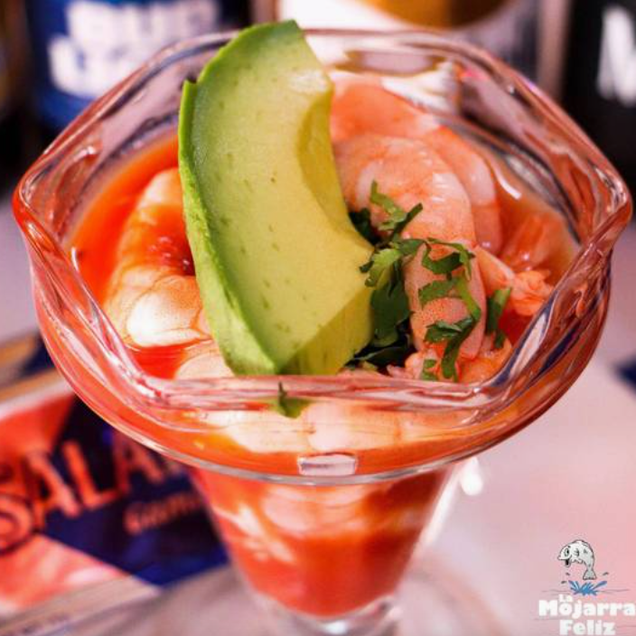 Delicioso cóctel de camarón tamaño grande en salsa roja, con aguacate.