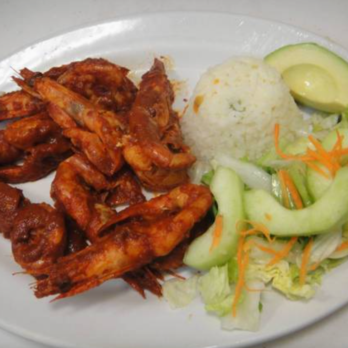 Exquisitos camarones (7 pzas,) bañados en salsa de chipotle, se acompaña de ensalada de lechuga, zanahoria rallada, pepino, arroz y aguacate, con un toque de vinagreta a la ensalada.