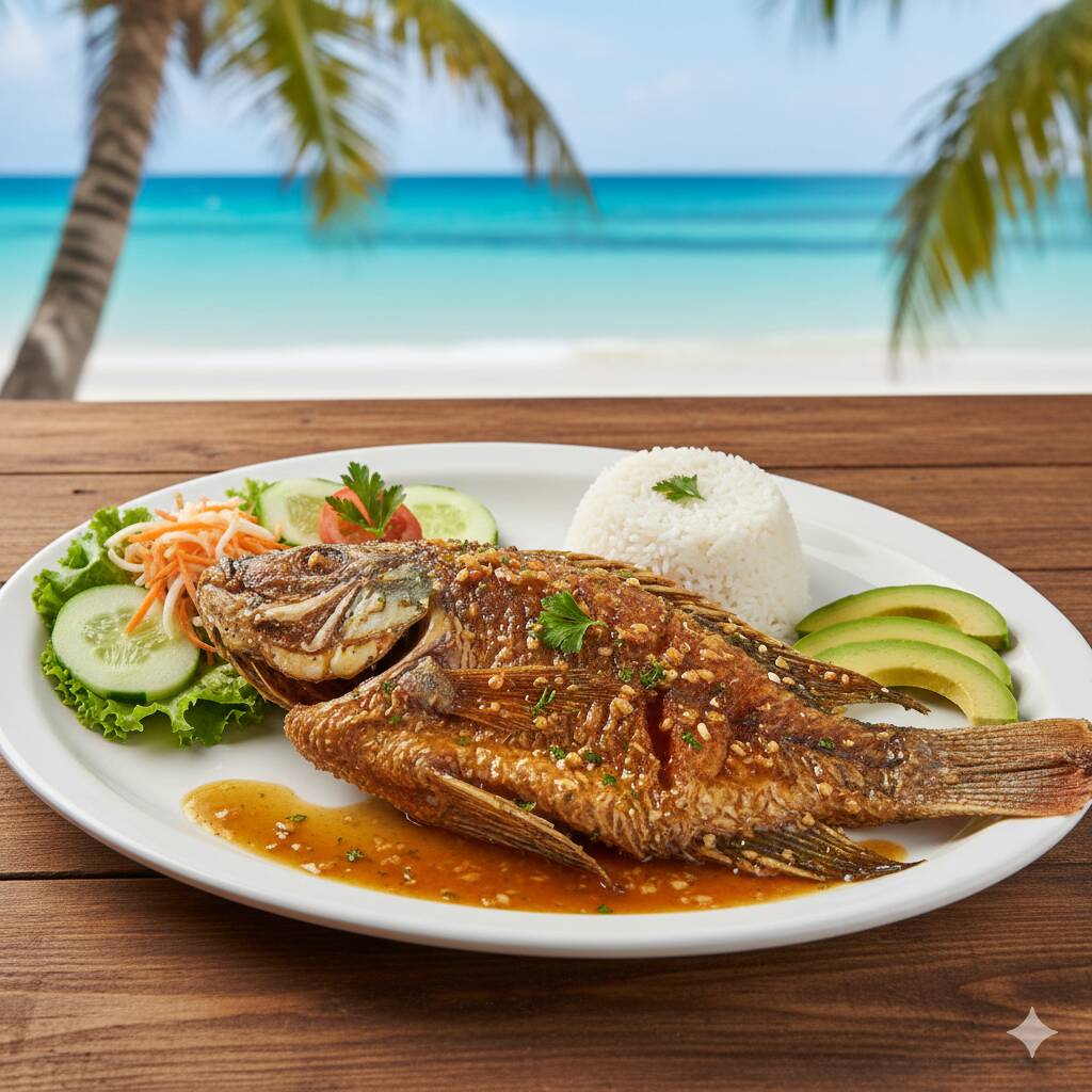 Exquisita mojarra (800 g) servida con trocitos de ajo dorados, acompañada de ensalada de lechuga, zanahoria rallada, pepino, arroz y aguacate, con un toque de vinagreta a la ensalada.