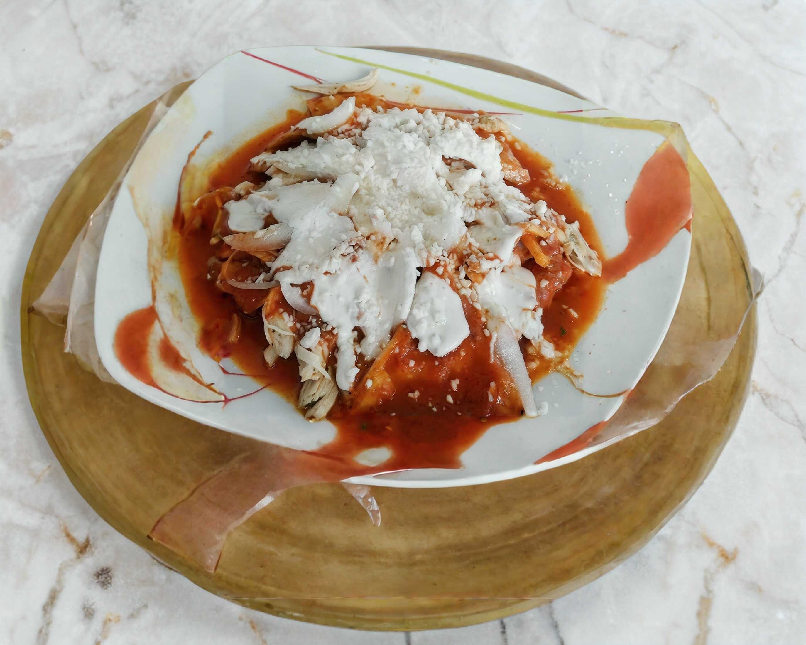 Acompañados de frijoles refritos, totopo, pan, fruta y cafe