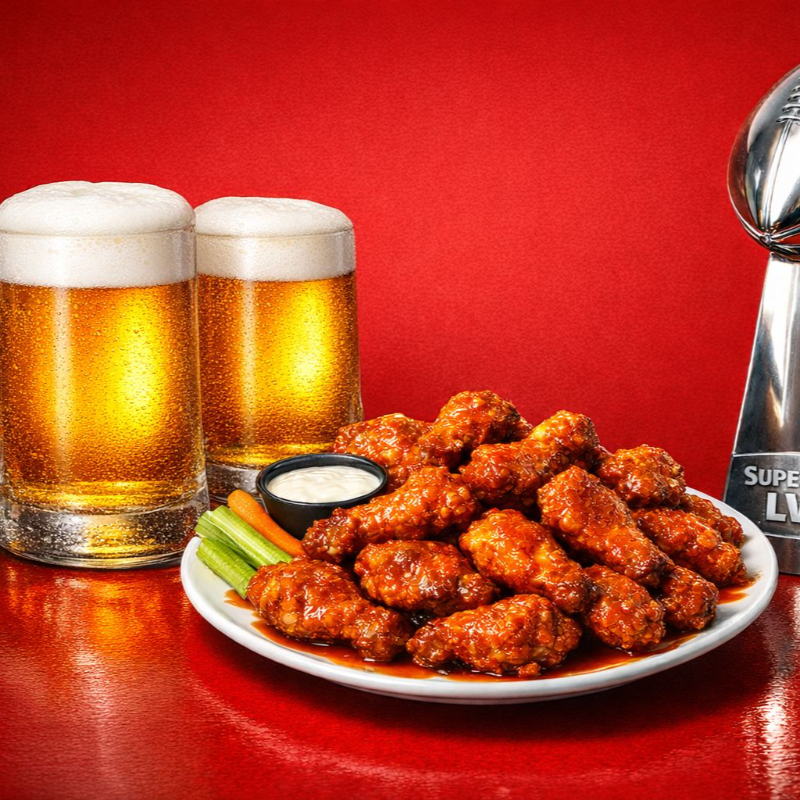 1 orden papas a la francesa, 10 alitas, 2 litos de cerveza