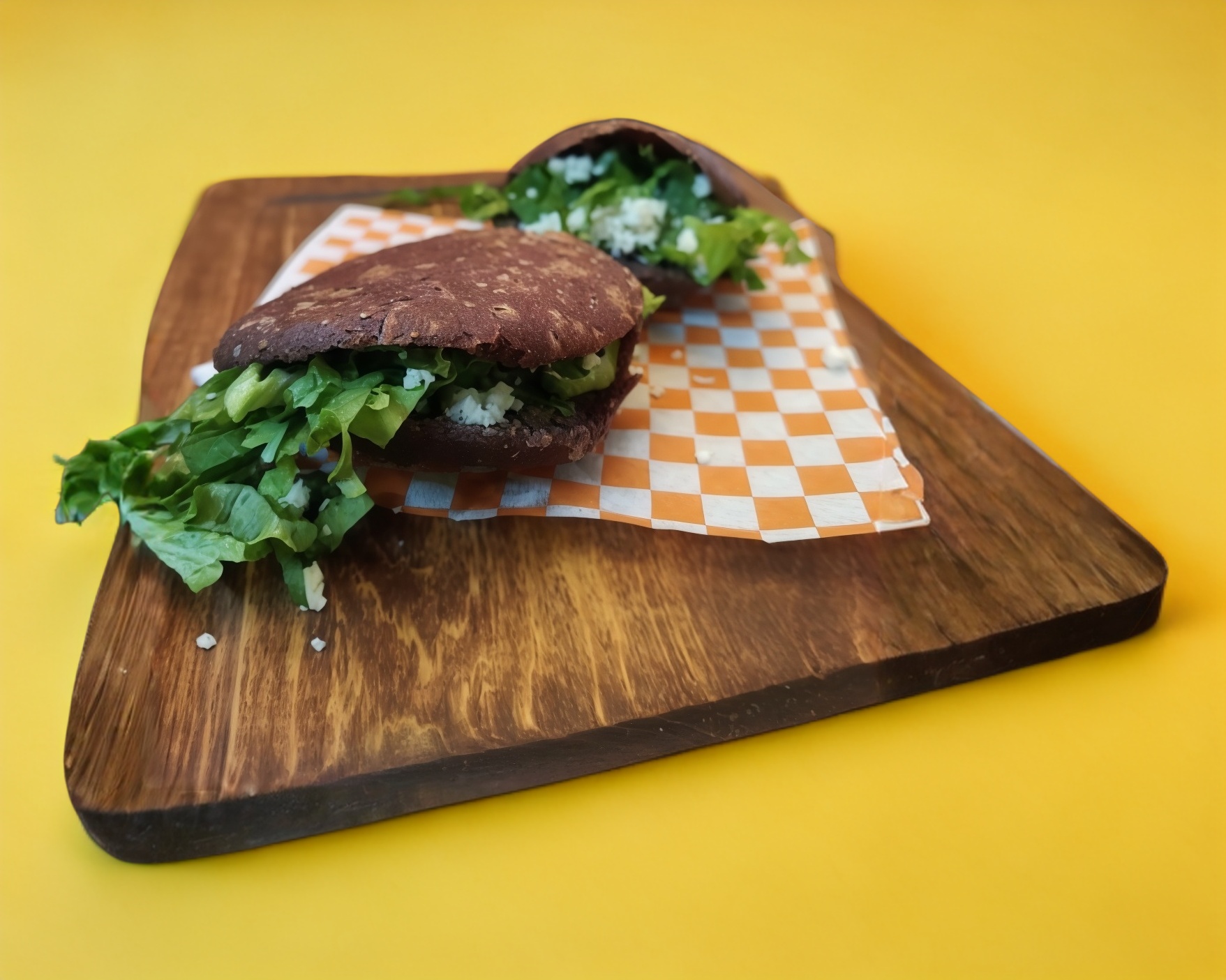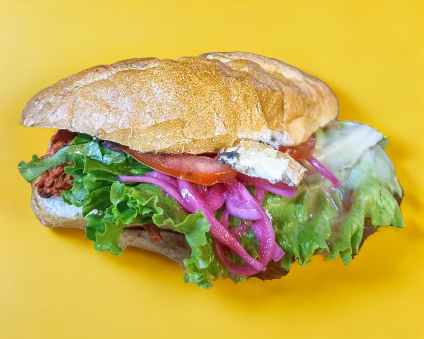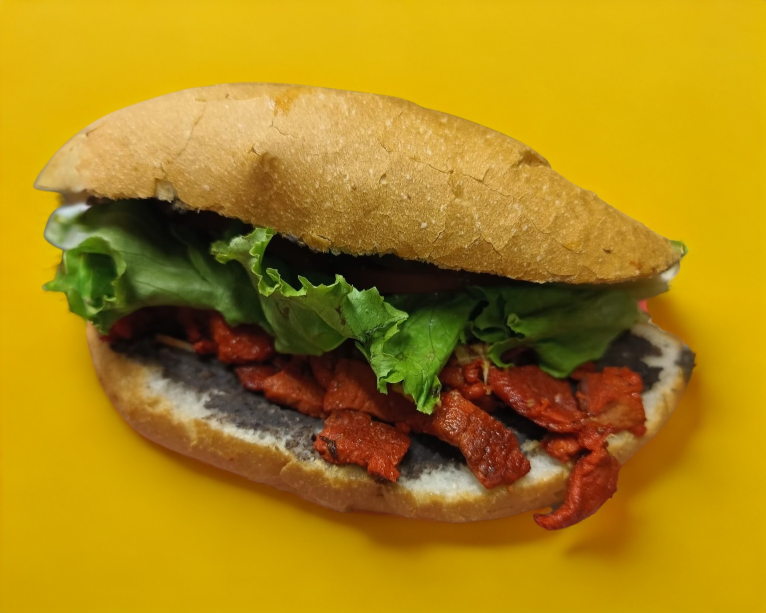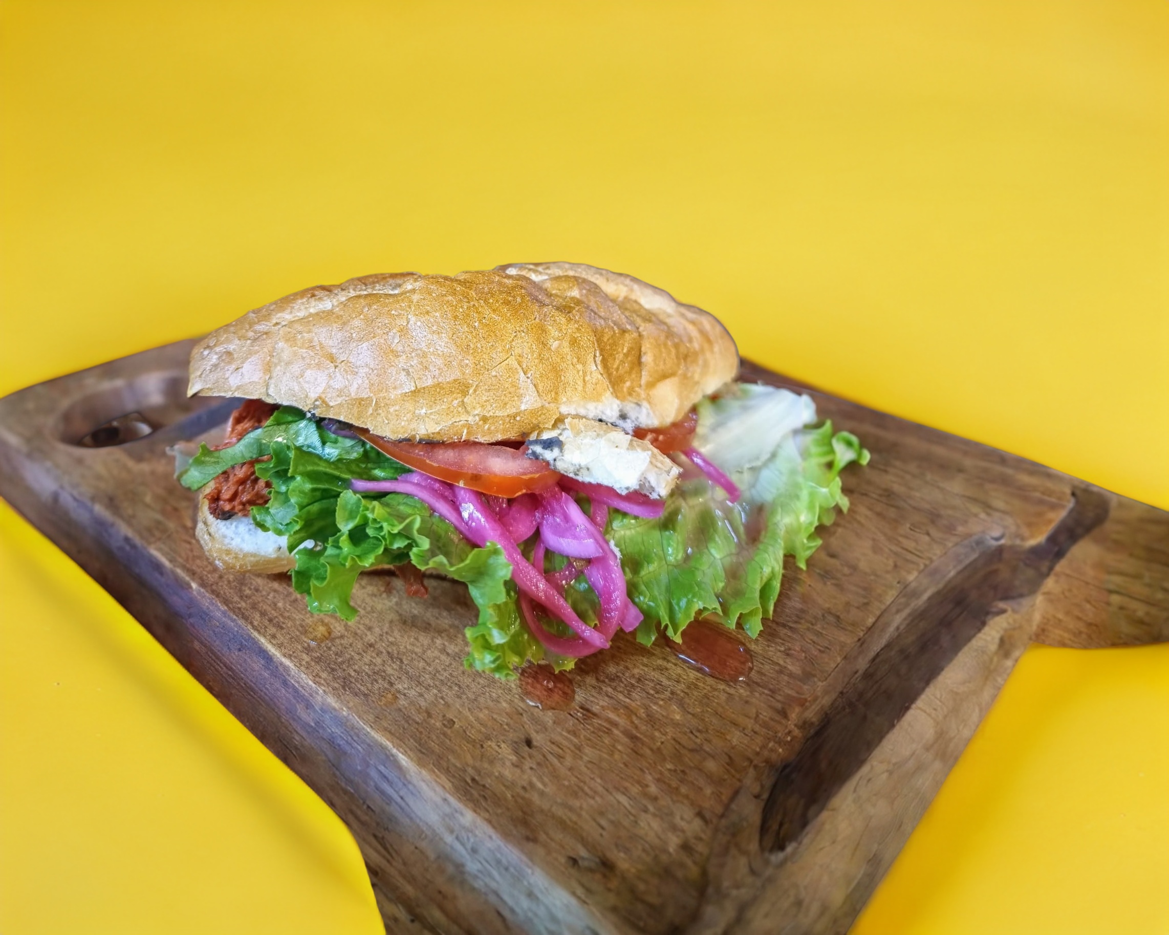BOLILLO GRANDE CON FRIJOLES REFRITOS, LECHUGA, JITOMATE, HILES Y MILANESA DE POLLO DORADITO