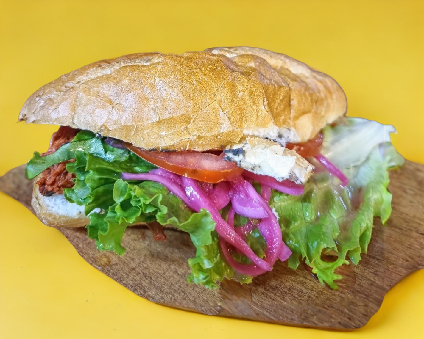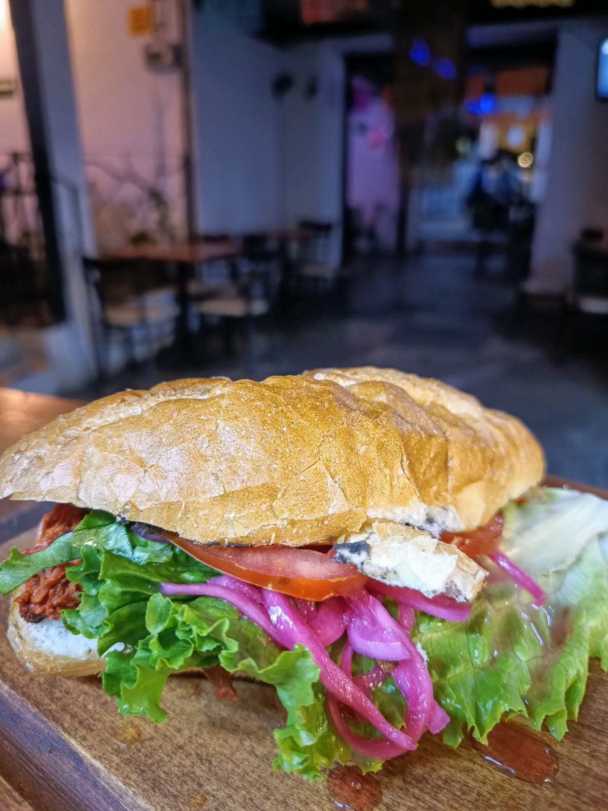 BOLILLO GRANDE CON FRIJOLES,LECHUGA, JITOMATE Y MUCHA COCHINITA PIBIL