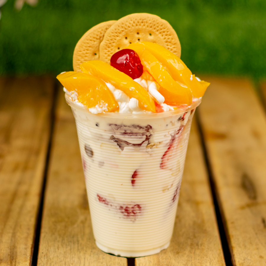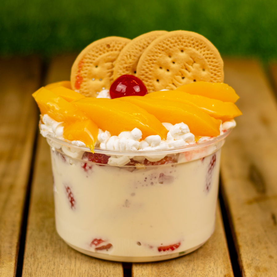 Fresas con crema y crema batida, 1 durazno en almíbar, lechera, cereza, 2 galletas marías.