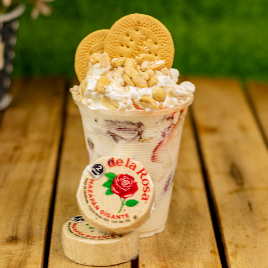 Fresas con crema y crema batida, mazapán, cacahuate, galleta maría.