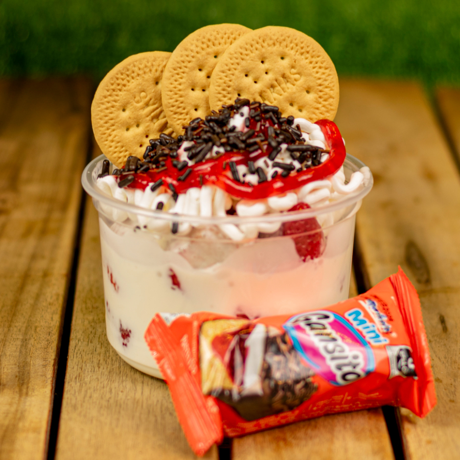 Fresas con crema, 1 Gansito, crema batida, granillo de Gansito, mermelada de fresa, galletas marías.