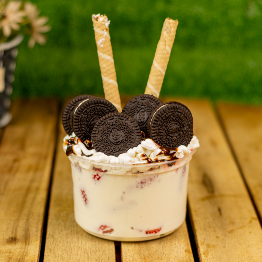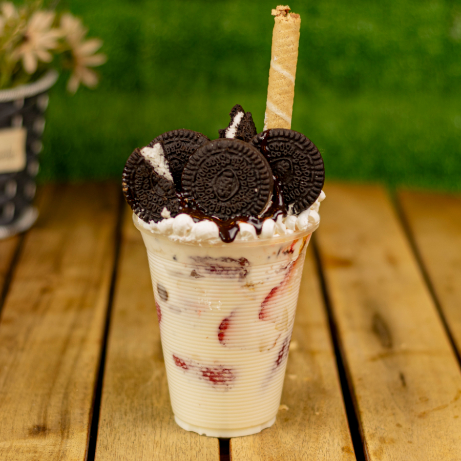 Fresas con crema y crema batida, galleta de Oreo molida, Hershey´s líquido, galletas Oreo, galleta Wafer.