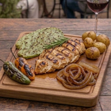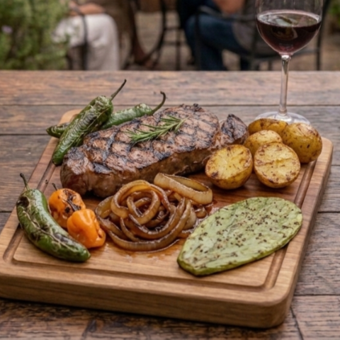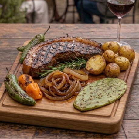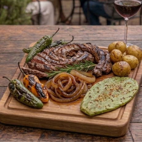Rib eye, chorizo argentino, chistorra, cebolla, salsa, nopal y chiles tatemados