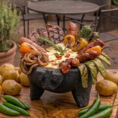 Arrachera, chistorra, aguja norteña, papa, queso, salsa, nopales y chiles tatemados