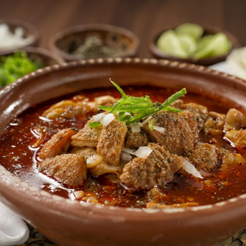Jugo de carne de la casa, acompañad de cebolla cilantro y chile picado