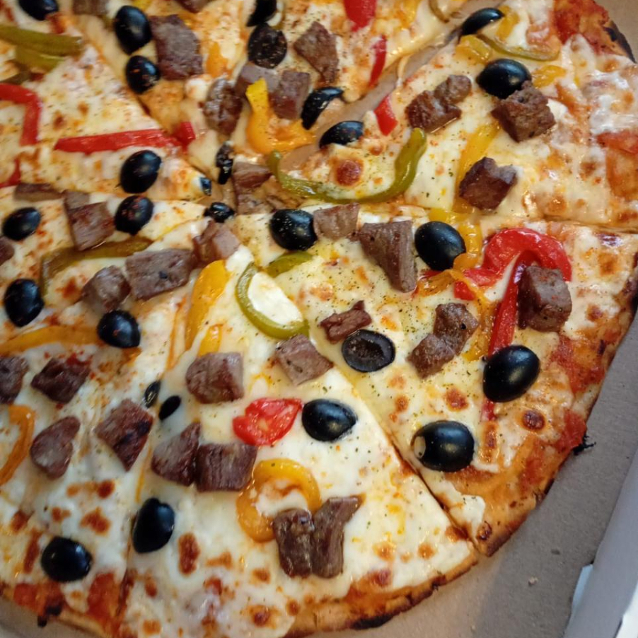 Salsa de tomate, mozzarella, arrachera, pepperoni, tocino, cebolla, pimientos