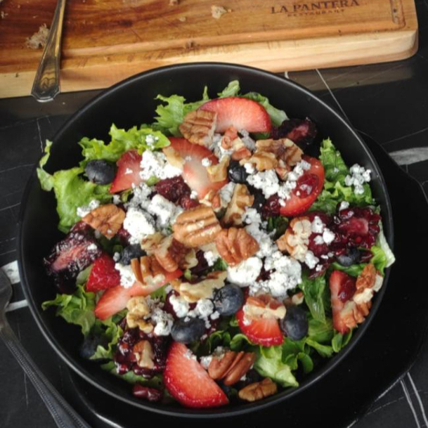 Lechuga de la casa, fresa, arandano, bluberry, queso cabra cenizo, vinagreta y aderezo