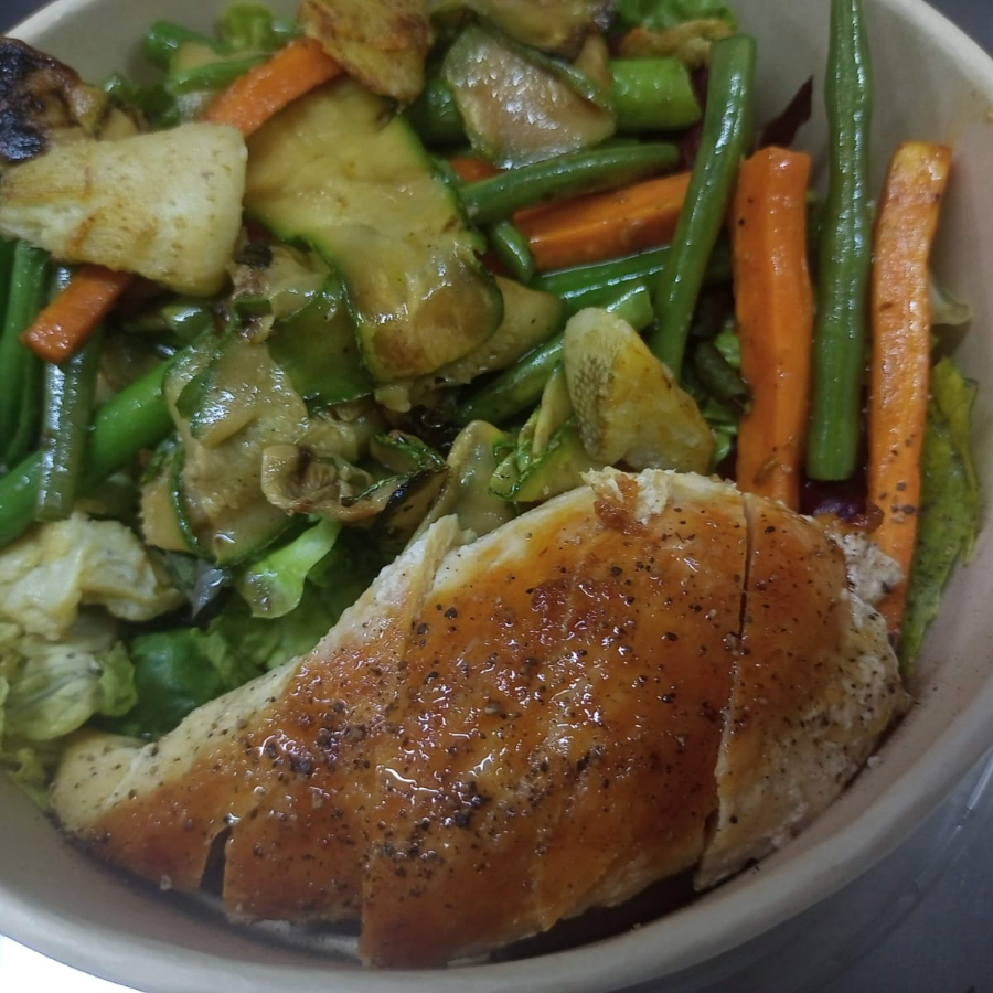 lechuga de la casa, jitomate Cherry, calabaza parrillada, arugula, nuez, zanahoria parrillada