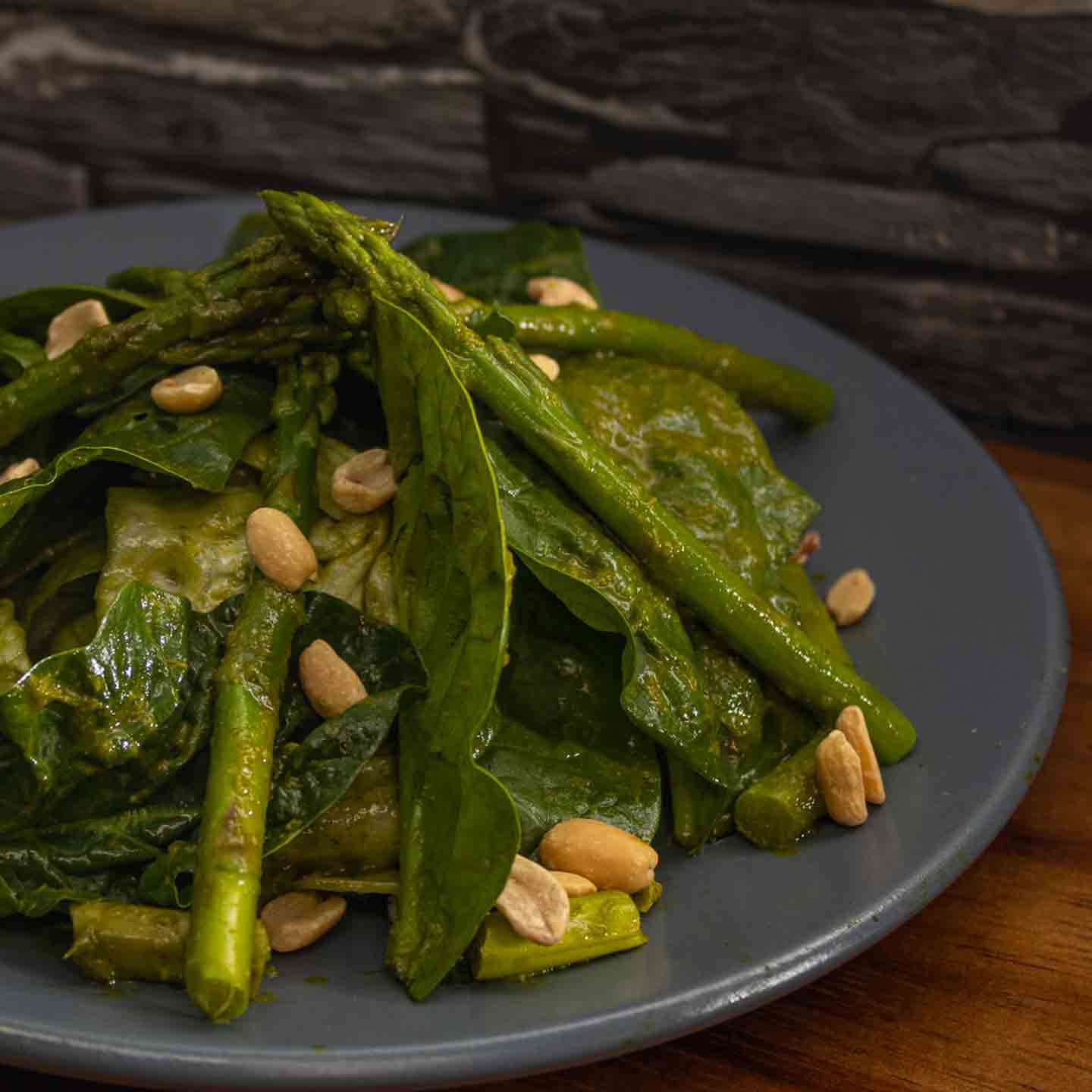 Lechuga, espinaca, esparragos, cacahuate acompañado con aderezo de perejil