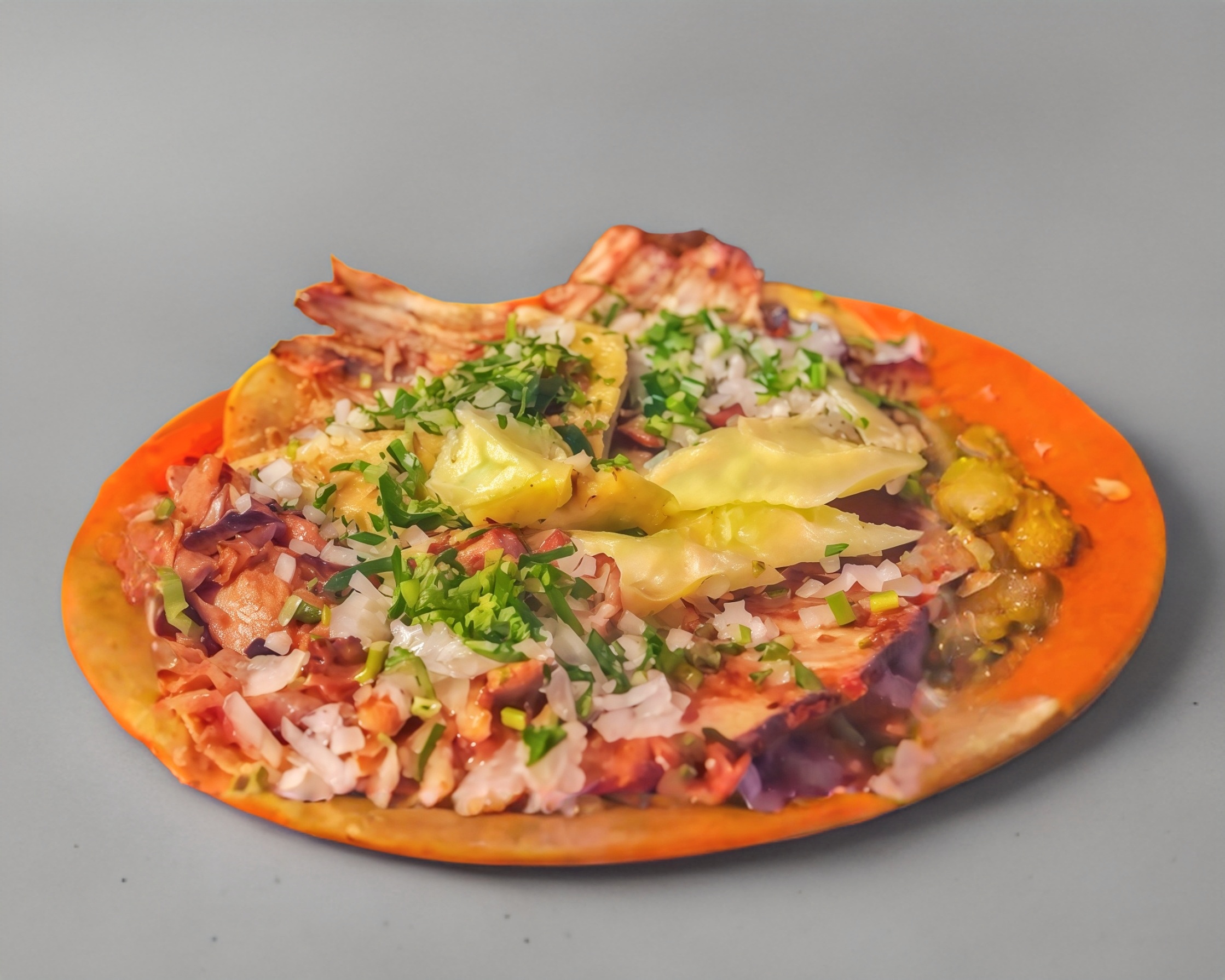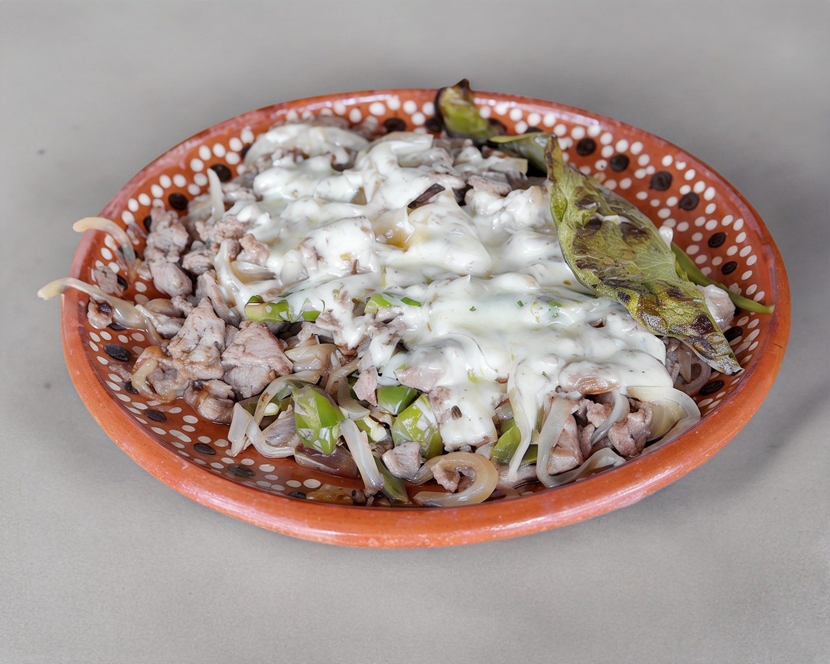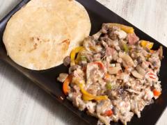 Pollo, bostec, tocino, cebolla y chile con queso gratinado a la plancha.